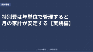 家計管理 特別費は年単位で管理すると月の家計が安定する【実践編】 月末に支出が膨らむ原因は特別費の見落とし。旅行・学費・冠婚葬祭などを年間で見積もってあらかじめ積み立てる仕組みを実践ベースで解説します。月の家計を安定させる特別費管理の実践編。 2026.04.05 家計管理