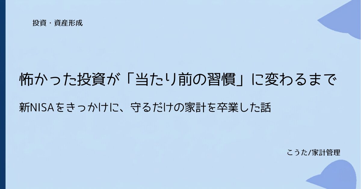 そんなときに出会ったのが、新NISA制度でした。この記事では、投資に縁がなかった僕が、新NISA制度を通して「守る家計」から「育てる家計」へ考え方が変わっていった過程をまとめます。